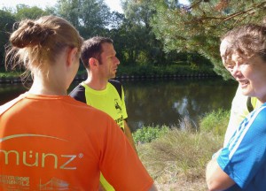 Und weiter ging´s: Trail war versprochen worden, und das gab´s dann auch. Kurz vor dem Teltow-Kanal überraschte ein großes Feld von Heidekraut (Erika) die Läufer, denn wir befanden uns schließlich in Höhe Dreilinden auf dem früheren Grenzstreifen, nicht aber in der Lüneburger Heide. Der anschließende Trampelpfad entlang des Kanals erwies sich als ebenbürtig mit vergleichbaren Wegen in südamerikanischen Dschungel-Gefilden. Mannshohe Gräser, Schilf, leider auch die ein oder andere Brennnessel. Eine Machete hätte durchaus an dieser Stelle Sinn gemacht… Zwischendurch sorgte dann Mauerwegläufer Holger Mischke für Abwechslung. Holger kümmerte sich nämlich wieder mal vorbildlich und mit der ihm typischen Gelassenheit um die Verpflegung der Läufer. Alle etwa 8 Kilometer stand er am Streckenrand – einfach toll und motivierend!