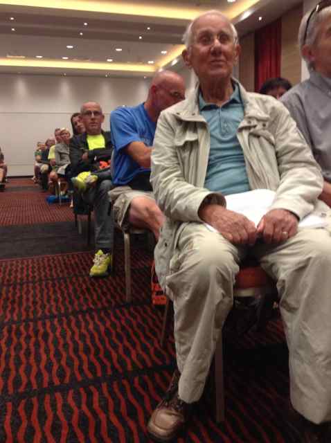 Vor über 300 Läufern, Betreuern und Helfern fand am Vorabend des Starts im Konferenzsaal des Ramada Hotels das Briefing statt, also die Wettkampfeinweisung. Wenn man das mit den 100Meilen-Anfängen von 2011 vergleicht, schon ein deutlicher Unterschied… Die wichtigsten Punkte: Wann ist der Start (6 Uhr am Samstag in der Lobeckstraße), wann werde ich disqualifiziert (beim Überqueren einer Straße bei roter Ampel – logisch!) und wie sehen die Richtungspfeile bei der Markierung aus (in diesem Jahr grün)? Ganz toll: Das Briefing gab’s auch in englischer und italienischer Sprache – extra für unsere Freunde der beiden 100Meilen-Partnerläufe, MMT100 bzw. TP100.