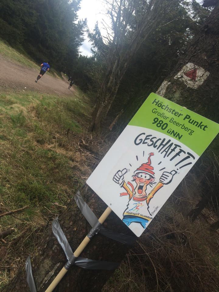 Es folgten ein paar unangenehme und sehr lange Steigungen. Ich schaltete ein Gang höher. Die Kraft war ja da. Die Anstiege bewältigte ich jetzt schneller als am Anfang. Bald war ich am höchsten Punkt der Strecke bei 973 m. Die Müdigkeit war weg. Bergab fing ich an zu rennen und zog das Tempo nochmal an bis zum nächsten Verpflegungspunkt bei 64 km. Ich begegnete Thomas und gemeinsam tänzelten wir im 200er-Takt (danke, Andreas Deak) den Berg runter. Am Verpflegungspunkt Kreuzwege bei 68km reichte mir eine Helferin ein Bier und sagte lächelnd: ‚Noch 4 km.‘ Ich kippte das Bier runter – jetzt gab es kein Halten mehr. Ich konnte Schmiedefeld regelrecht spüren und ich sprintete im Höllentempo weiter.