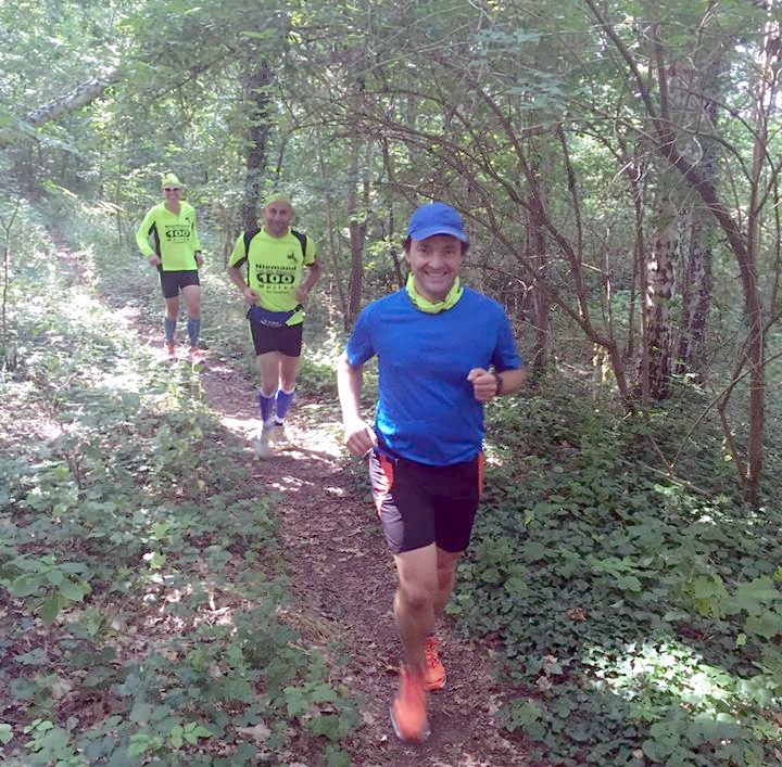Allerdings gab mir die Verpflegung Zeit zur Regeneration und Tom meinte nur: „Durchlaufen wäre doch kein Problem.“ Außerdem sollte die sechste Runde eine Wiederholung der zweiten sein, sodass mir die Strecke also bekannt war. Mit Wolfgang Schwericke als Guide des gesamten Laufes und neun weiteren Unerschrockenen haben wir uns auf den Weg begeben. Das Tempo konnte ich zwar mitgehen, hielt mich aber immer am Ende der Gruppe auf. Nach ca. 4 Kilometern sind wir dann von der Strecke abgewichen, und der Trailteil begann. Auf den war ich überhaupt nicht eingestellt, weil ich die Ansage von Wolfgang nicht bekommen hatte, als er darüber informierte. Zu Beginn konnte noch richtig gelaufen werden, aber immer wieder ging es über umgestürzte Bäume oder andere Hindernisse, die das Tempo verlangsamten, was ich als gar nicht schlecht empfand. Aber die Konzentration war jederzeit gefragt, um nicht zu stolpern. Die Gruppe entfernte sich außer der Sichtweite, wartete aber auch immer wieder. Nach mehreren erfolgreichen Versuchen, das Stolpern zu vermeiden, erwischte ich doch einen Ast auf dem Boden, den ich nicht gesehen hatte. Ich blieb mit dem rechten Fuß hängen und verspürte einen Schmerz. Ähnlich wie in dritten Runde konnte ich aber sofort schmerzfrei weiterlaufen. Einen knappen Kilometer später war das Trailstück geschafft, und wir waren auf der Strecke, die ich schon kannte. Auf Nachfrage bei Wolfgang waren es nur 2 Kilometer zum Ziel. Den nächsten Anstieg bin ich dank einiger Reserven und auch ein bisschen Adrenalin hinauf gesprintet. Drei weitere Läufer schlossen sich mir an, und wir sind das letzte Teilstück deutlich unter 6:40 min./km gelaufen und auch ein Zielsprint war noch drin.
