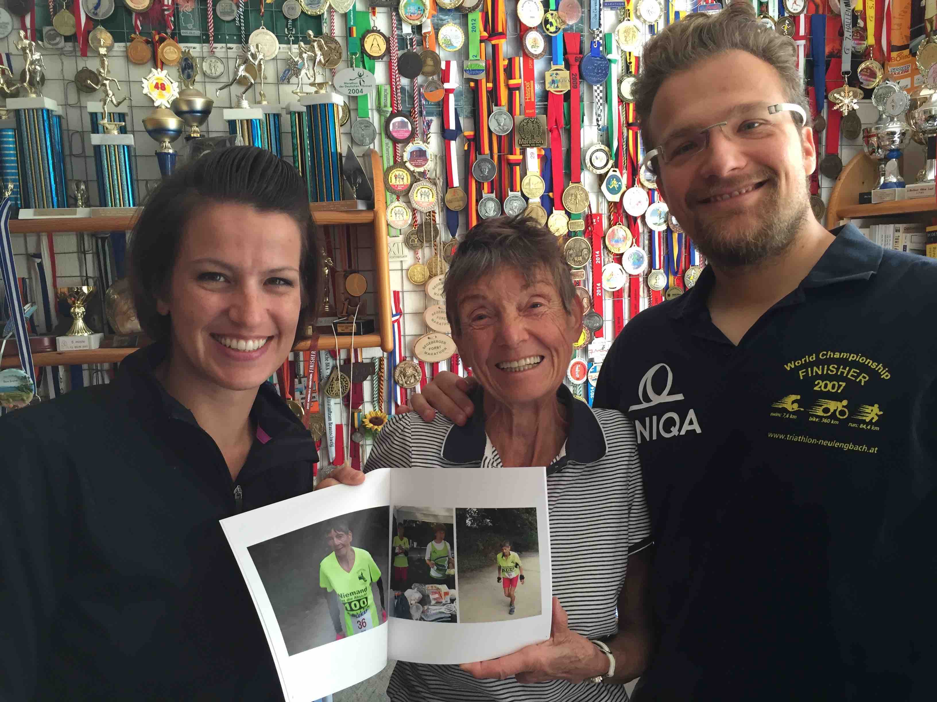 Die kleine LGM-Geburtstagsdelegation rief nicht an, sie stand einfach vor der Haustüre. Stefanie Osbahr, die gerade ihren allerersten Marathon gemeistert hatte, und Transeuropalauf-Finisher Marcel Heinig überreichten ihr zusammen mit dem LGM-Vorsitzenden Alexander v. Uleniecki einen Bildband mit Highlights vom Bernauer 24-Stunden-Lauf. Dort hatte Sigrid einen neuen deutschen Altersklassen-Rekord in der W75 aufgestellt. Das obligatorische Foto vor der „Wall of Eichner“ mit einer wahren Flut von Medaillen durfte natürlich auch nicht fehlen.