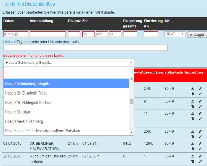 Dies ist der Link zum „I run for life Deutschland-Cup„. Es können alle Wettkampfkilometer eingetragen werden, die durch Laufen, Walken allein oder in Teams/Staffeln oder im Rahmen eines Triathlons zurückgelegt wurden und im Internet verlinkbar sind. Ihr findet das Hospiz in der Dropdown-Liste und könnt es durch Herunterscrollen anklicken (siehe Screenshot).