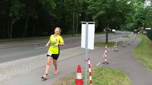 Bei der 5km-Marke stehen Norbert und Sylke. Norbert ruft mir zu: „28 für 5“. Ich bin äußerst erfreut über das Tempo und kann das auch halten, obwohl ich Bauchweh habe. Ich sehe Vera und erkenne, dass es ihr gut geht und sie rund läuft. Ich kann den Abstand zur Vorletzten verkürzen und am Ende auf 18 Sekunden drücken. Mit einer 10km-Zeit von 56 Minuten bin ich total happy und damit nicht die Langsamste auf der Strecke.